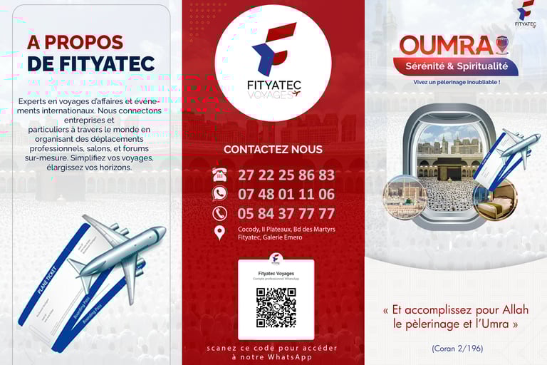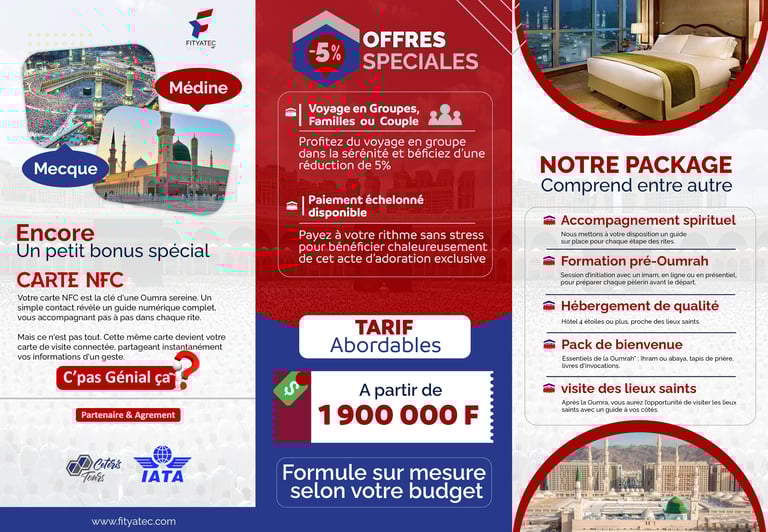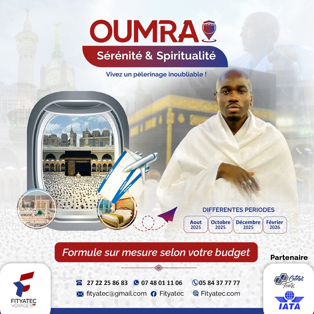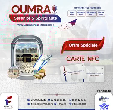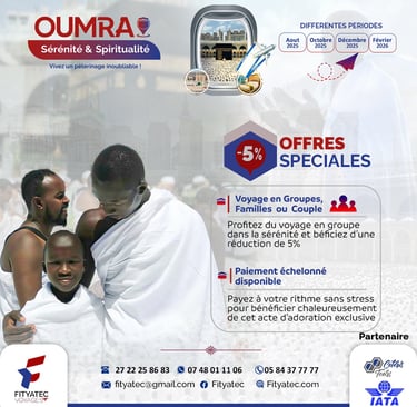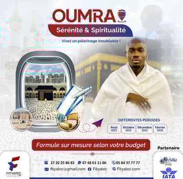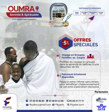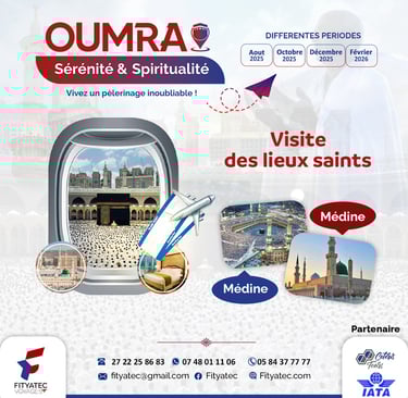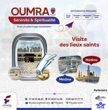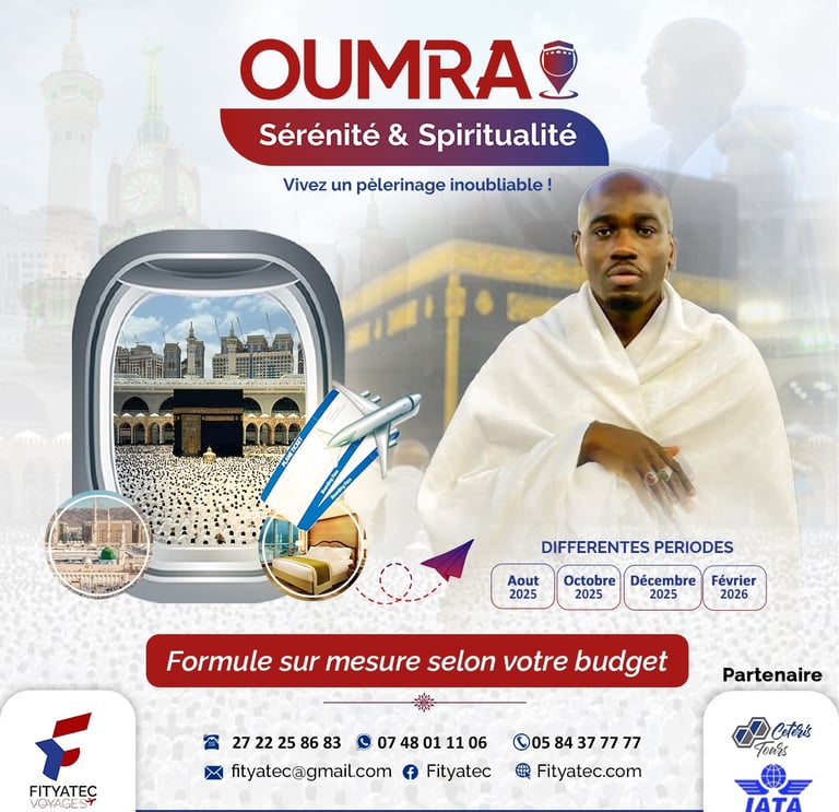 Avec FITYATEC VOYAGES, vivez une expérience spirituelle unique, accompagnée d’un encadrement religieux et logistique de qualité, pour vous concentrer sur l’essentiel : votre adoration.