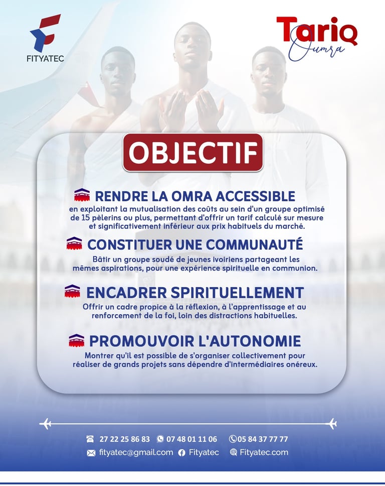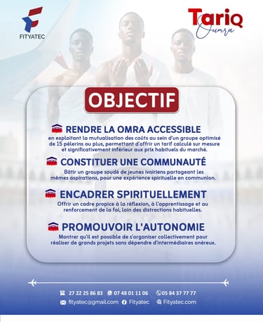 Tariq Omra s'adresse à toute la jeunesse musulmane de Côte d'Ivoire qui rêve d'accomplir ce pilier de la foi. Nous accordons une emphase particulière aux jeunes entrepreneurs qui cherchent à placer leurs affaires sous la bénédiction d'Allah et à renforcer leur baraka par un acte d'adoration sincère.